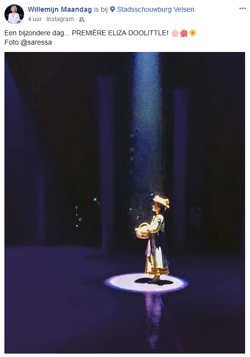 Vanavond zal Willemijn Maandag voor de eerste keer de hoofdrol -Eliza Doolittle- gaan spelen in My Fair Lady! Mocht u hier getuige van willen zijn, dan kunt u terecht in de Stadsschouwburg in Velsen!